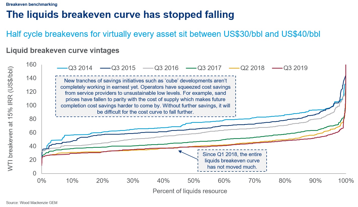 This comes from a presentation that Ryan Duman, WoodMac’s principal analyst for Lower 48 upstream research, gave recently. A steady decline in production costs has been crucial to the shale oil revolution in the US over the past decade. But now it looks as though, since early last year, those costs may have bottomed out. The successive lines here show cost curves year by year getting lower each time, until 2019. The promise of ever-cheaper barrels, which has been an important element in the case for investing in shale, now seems to be fading away.