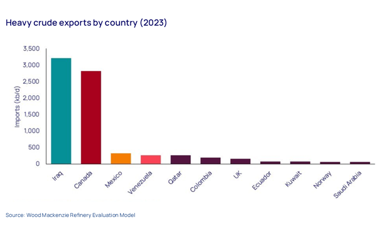 This comes from a recent note by Wood Mackenzie’s Kian Akhavan, looking at the future of Canada’s energy infrastructure. It shows the world’s largest exporters of heavy oil, with Canada and Iraq way out ahead of the rest. With no tariffs, crude from Canada is advantaged against crude from Iraq for refineries on the US Gulf coast. If the US goes ahead with its threatened tariffs on Canadian oil and gas, it would have to be priced to remain competitive against Iraqi barrels.