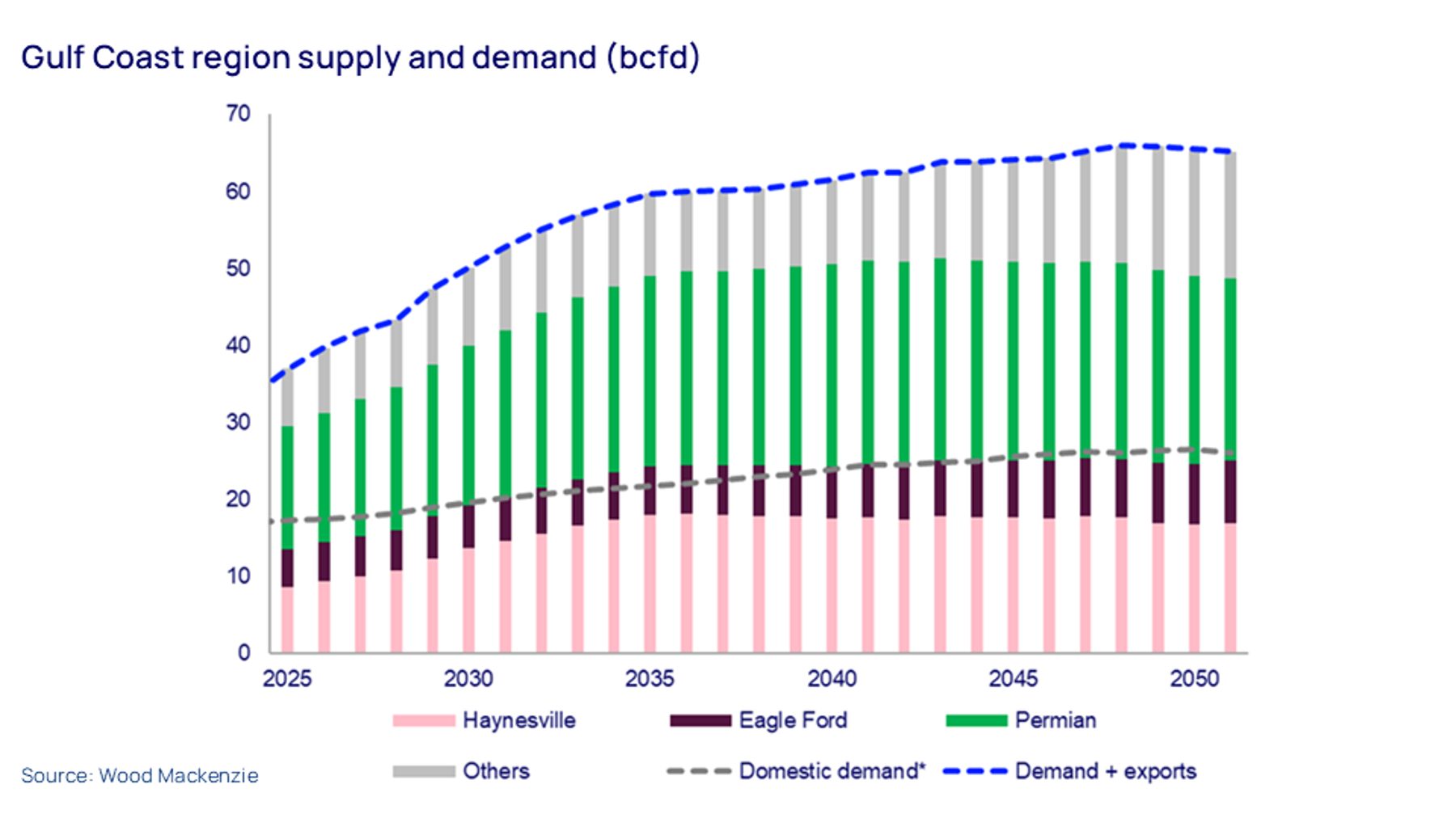 In response to rising demand growth, our latest report assesses how US Gulf Coast natural gas supply will evolve. The Permian and Haynesville each play a critical role in supporting most of the region’s expansion. Each region provides about 10 bcfd of growth to Gulf Coast demand centres at long-term peaks. Permian-associated gas production provides essential supply flexibility through enhanced pipeline connectivity across the region. Meanwhile, Haynesville non-associated production experiences accelerated growth into the mid-2030s, supporting West Louisiana's export ambitions.