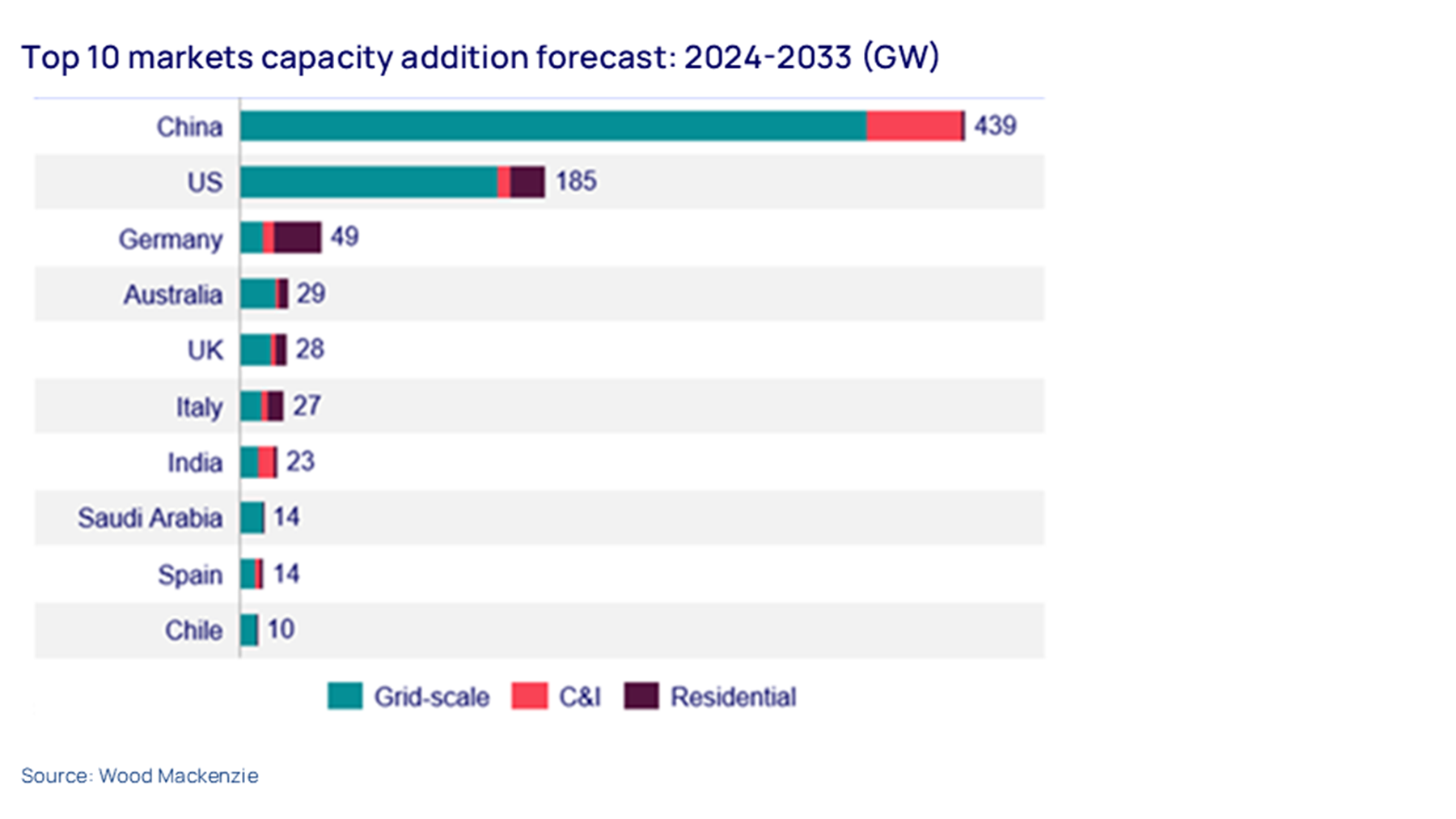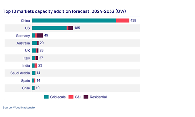 In November 2024, COP29 agreed to a global energy storage target of 1,500 GW by 2030, up from 340 GW today, covering all technologies, including BESS and pumped hydro. China has been quick to identify storage as a critical technology to maximise renewable generation. Through its low-cost LFP battery manufacturing and renewables coupling policies, China now accounts for around half of global installed storage capacity. It will broadly maintain market dominance with plans to commission 45% of total new capacity additions over the next 10 years.