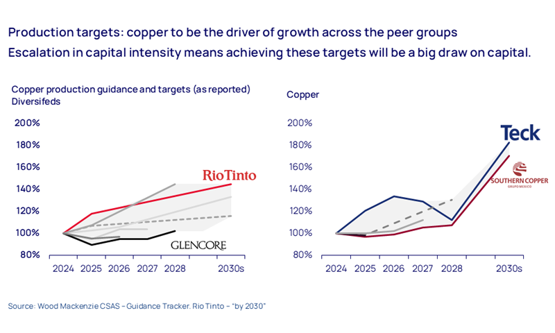 The thirteen companies have flagged an increase in 2025 averaging almost 10%. This will lift spend for the peer group to a combined US$60 billion in 2025, just under half of the total across the entire metals and mining sector. What’s interesting is that the increase comes after an extended period of capital discipline and contrasts with the rest of the global sector. We forecast at the start of the year that overall spend in mining would fall by 10% to 15% driven by a continued fall in investment in steel, iron ore and coal.
