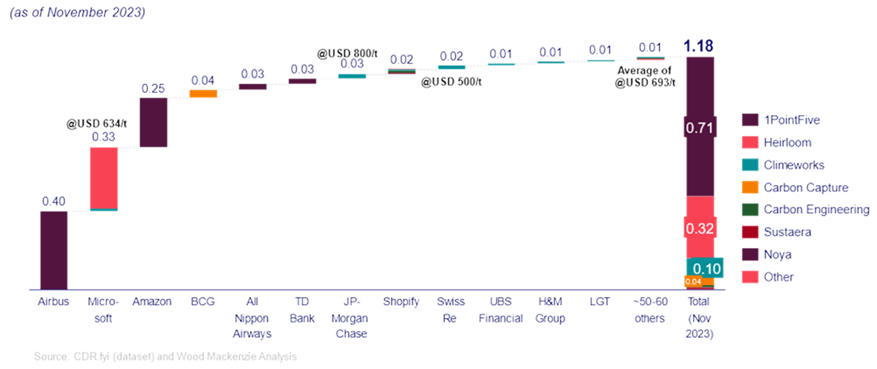 Major companies have been willing to pay premium prices for voluntary carbon offsets for DAC. The market is small (1.18 Mt as of 2023), but offsets have traded upwards of US$600/tCO2, multiples of the price of alternative offsets. Buyers in hard-to-abate sectors such as aviation are patently keen to support the market development of DAC.
