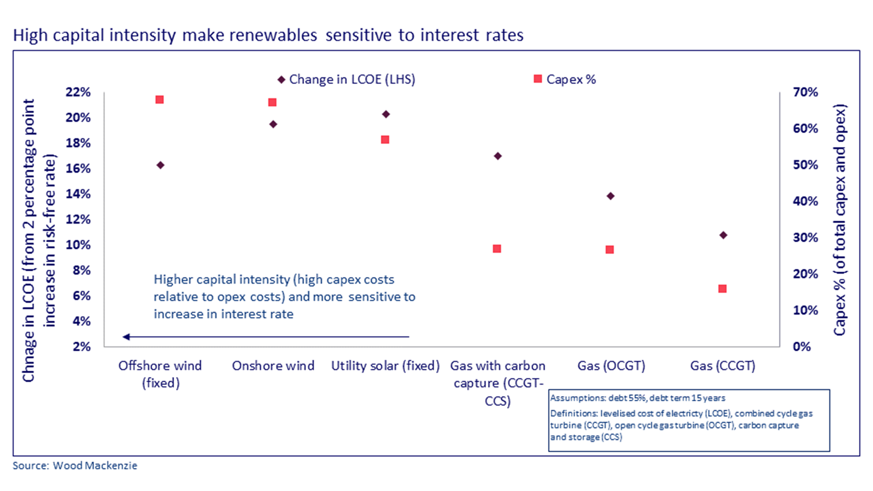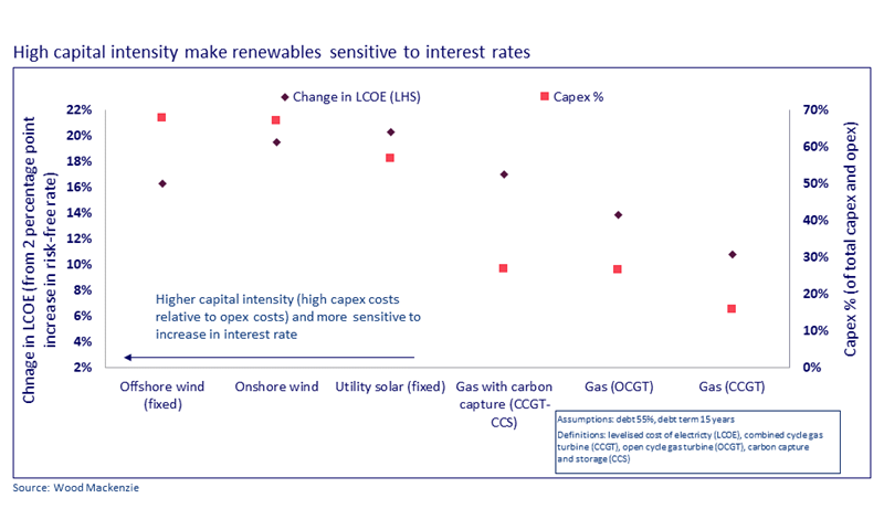 Higher rates will reduce renewables’ competitiveness in power markets. Our analysis shows that a 2% increase in the risk-free interest rate pushes up the levelised cost of electricity for a renewables project by 20% compared with only 11% for a combined cycle gas plant.