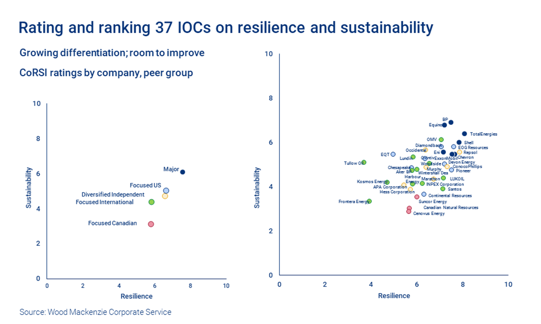 The Resilience Index assesses 37 IOCs’ ability to deal with near-term shocks; the Sustainability Index is longer term, assessing their ability to navigate the energy transition.