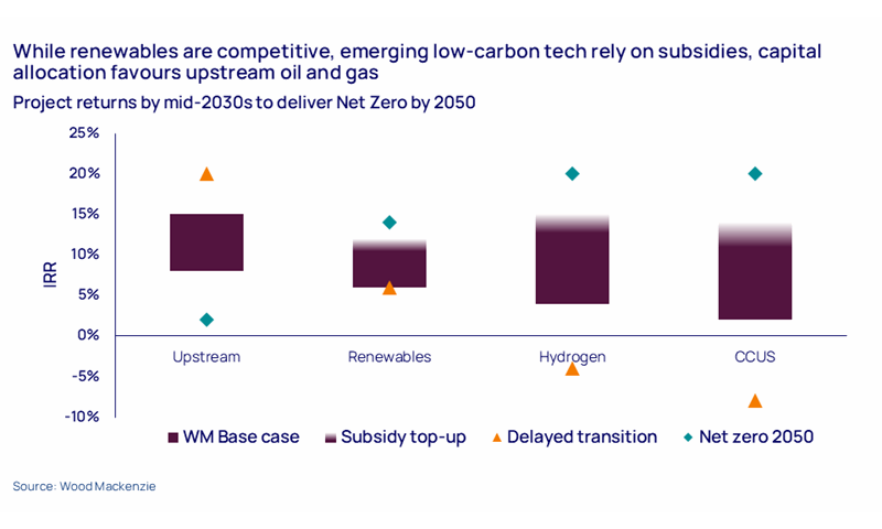 Upstream projects, in contrast, can look highly attractive in the current environment. The slow pace of the transition implies stronger-for-longer oil and gas demand and the prospect of firm oil and gas prices. That combination underpins double-digit returns for Wood Mackenzie’s pipeline of pre-FID projects.