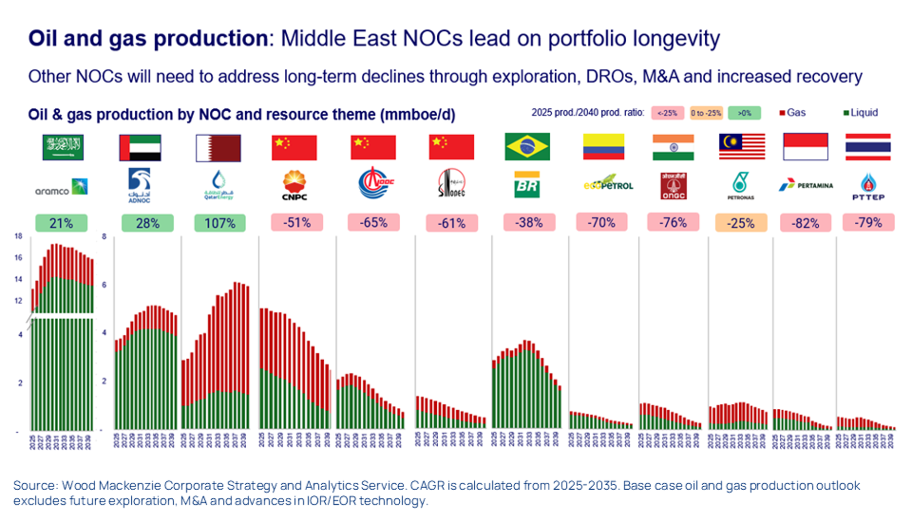 Essentially, more NOCs see internationalisation as a way to strengthen their portfolio in anticipation of resilient global oil and gas demand into the next decade. But each has its own motive. Some are looking to offset maturing domestic production – Asian and Chinese NOCs, even with years of internationalisation behind them, still face steep declines over the next 15 years. Others, with more stable or even growing production through 2040, including ADNOC and Saudi Aramco, want to diversify from an oil-weighted domestic portfolio into international gas and LNG. Qatar Energy, gas-weighted domestically and already with international LNG exposure, is investing in frontier exploration.