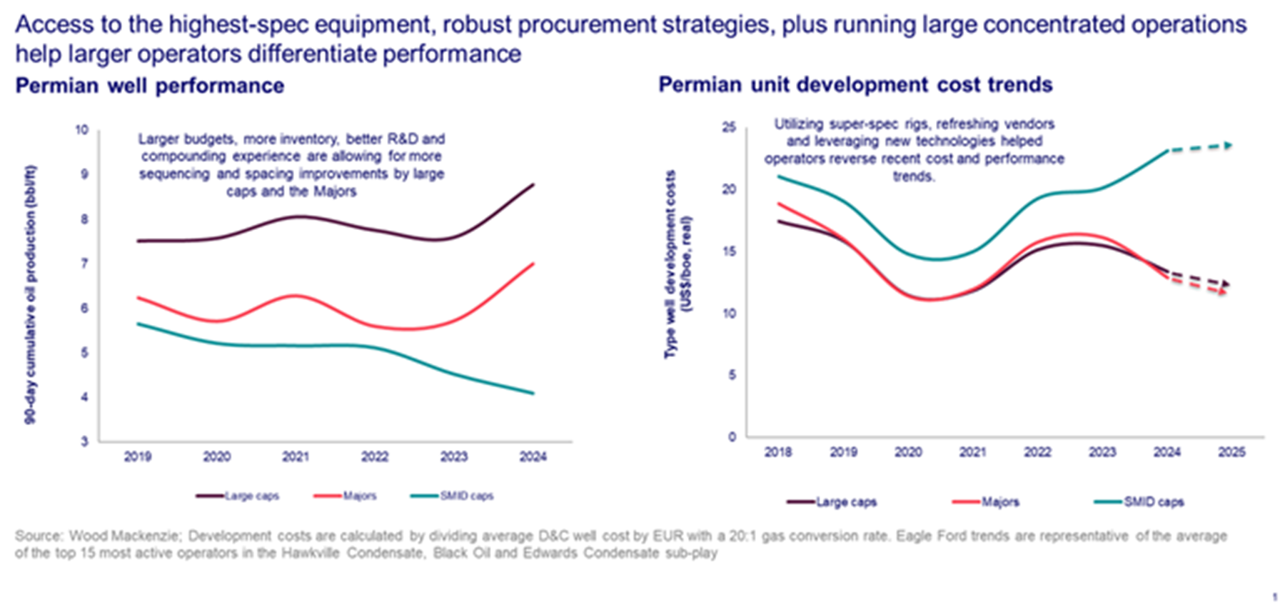 The ‘haves’, the Permian’s bigger players, not only hold the most but also the best acreage. At current rates of drilling, an elite group of seven companies will have almost all of the remaining inventory with breakevens below US$45/bbl WTI by 2030. The ‘haves’ continue to drive down costs and improve performance trends through scale, repetition and value chain integration. In contrast, the ‘have nots’, generally smaller players, are already finding well performance trends deteriorating. To grow into the 2030s, they face having to drill out mostly higher-cost inventory.