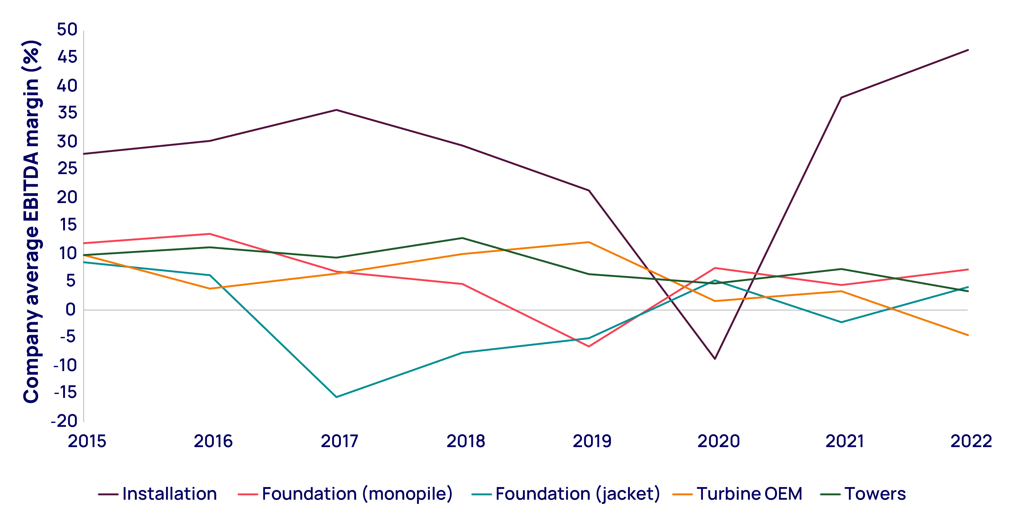 Companies in the offshore wind supply chain have seen declining EBITDA margins since 2015, when the industry had built out its capacity to supply around 800 turbines. Since 2015, turbine installations have averaged around 500 a year. Even in 2022, only 678 turbines were installed outside China.