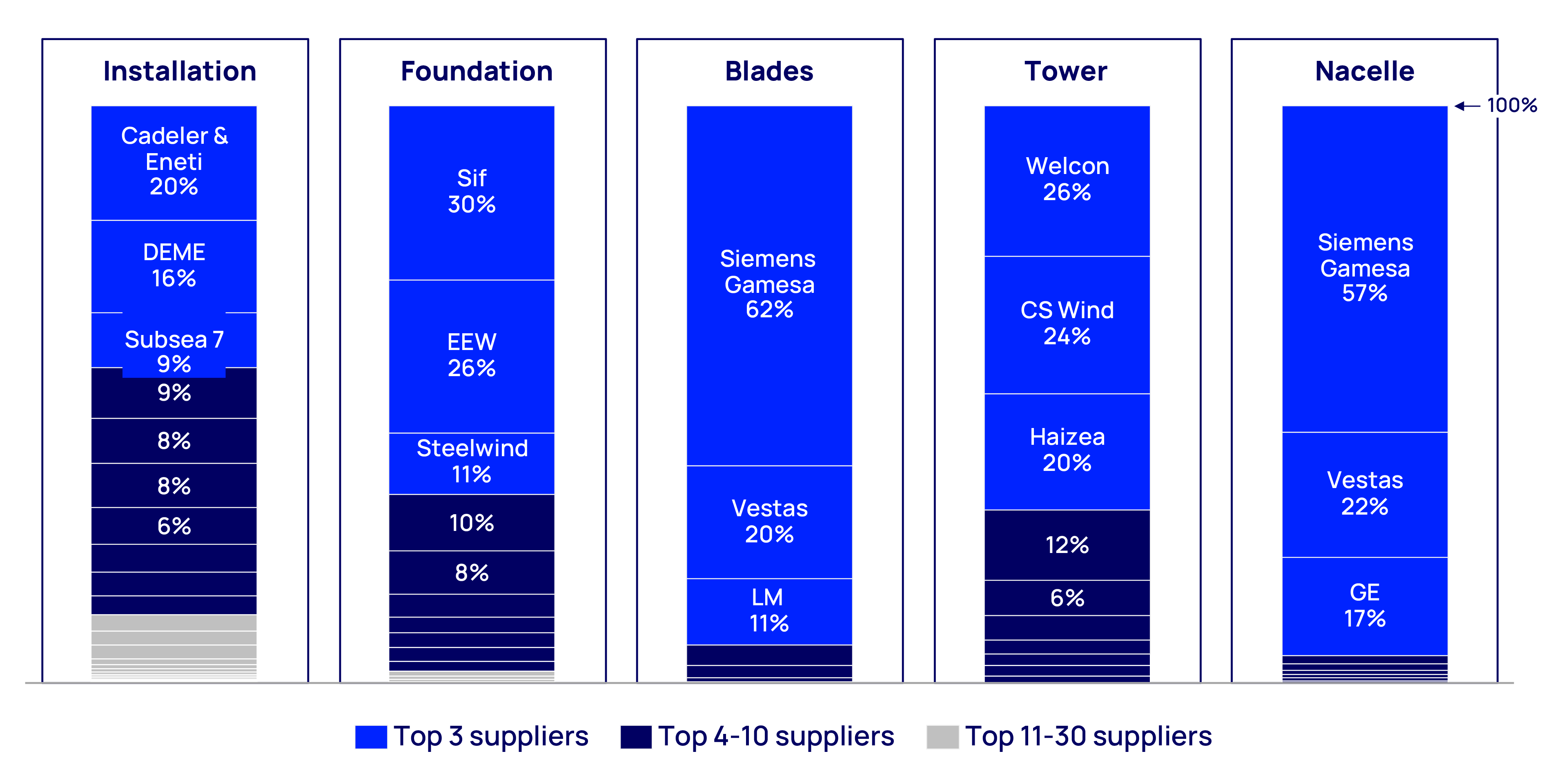 The offshore wind supply chain has become highly concentrated over the past decade. The top three producers of blades, nacelles and foundations account for 93%, 96% and 67% of their respective markets. Not securing capacity with one of the dominant companies could mean having to deal with a considerably less experienced player. Given the weak financial condition of many supply-chain companies now, an exit by any of the companies could have a detrimental impact on the industry’s ability to meet expected demand.