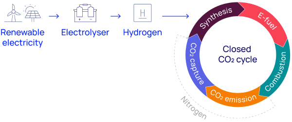 E-fuels are produced by combining electrolytic (green) hydrogen, made by electrolysing water using renewable electricity, with captured carbon or nitrogen. An e-fuel can be considered carbon neutral if the emissions released into the atmosphere during its combustion are equal to (or less than) the captured COâ‚‚ used to produce it.
