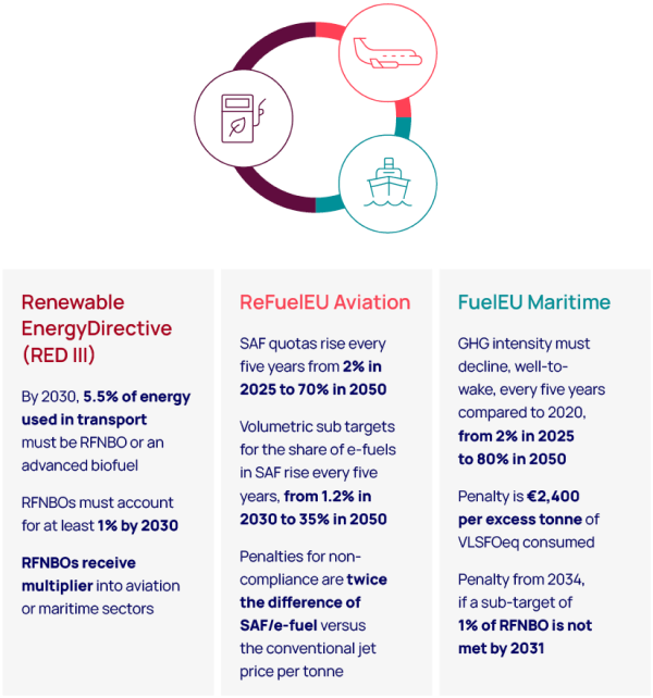 The ReFuelEU Aviation and FuelEU Maritime laws are designed to give investors certainty that the cost gap between low-carbon fuels and incumbent fuels can be closed. Underlying RFNBO mandates encourage developers to pursue e-fuel production opportunities.