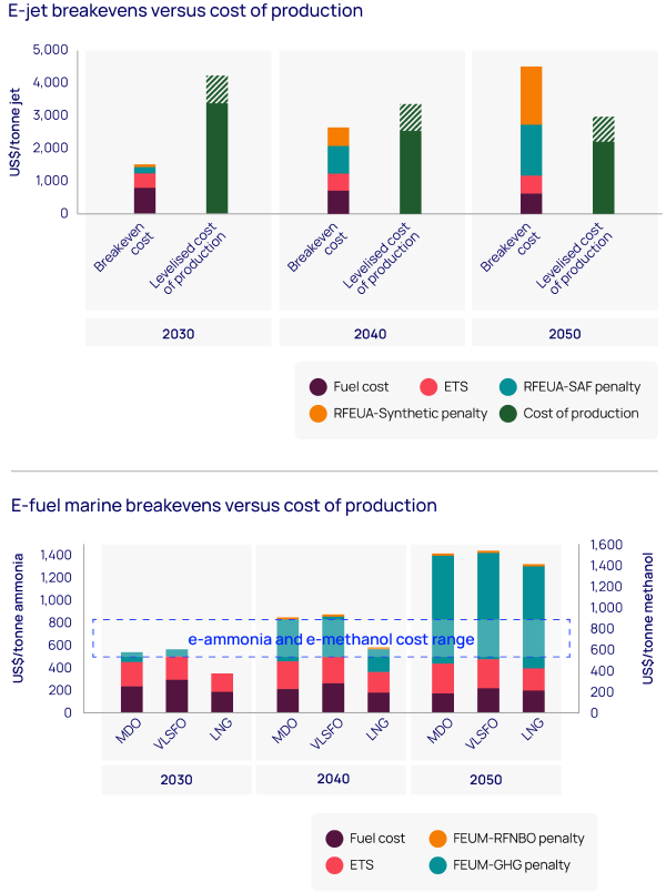 ReFuelEU Aviation applies penalties where SAF and RFNBO fail to meet targets. Penalties increase over time, so that by 2040, the lowest-cost e-jet producers will be able to compete for some demand without subsidies. Under FuelEU Maritime legislation, e-methanol and e-ammonia will compete without subsidies from 2040, as the penalties for not meeting GHG targets and RFNBO mandates increase the marginal cost of running on incumbent marine fossil fuels.