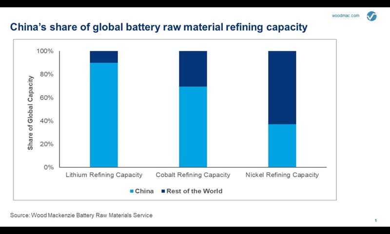 But there’s a major obstacle to achieving this. At present, China accounts for almost 75% of global lithium-ion battery manufacturing capacity and this share is set to increase through the short term with its build-out of new facilities. And although the US and Europe are enacting policies to encourage domestic battery production, there has been a distinct lack of support for investment in the supply and refining of the raw materials to achieve this. In China, the opposite holds true.