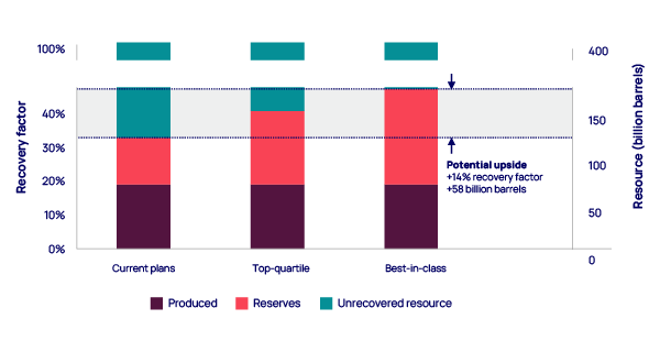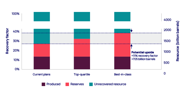 If every field were to achieve top-quartile performance, this would boost average recovery factor to 34%, adding 470 billion barrels of reserves. Best-in-class performance would increase the average recovery factor to 41% and add more than 1,000 billion barrels.