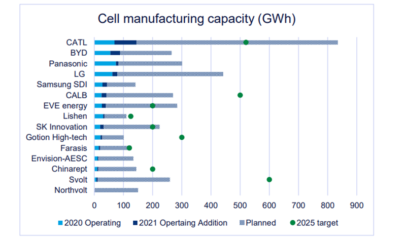 The top 15 manufacturers by planned capacity put into operation a total of about 200 GWh in 2021, and the cumulative capacity reached 600 GWh. Meanwhile, 3,000 GWh of capacity is at the planning or construction stage. CATL leads the expansion with outstanding operating and planned capacity – 800 GWh in total by 2030. Chinese battery manufacturers such as SVOLT, CALB and Gotion High-Tech also have ambitious 2025 capacity targets. Wood Mackenzie expects many more new plant announcements in 2022.