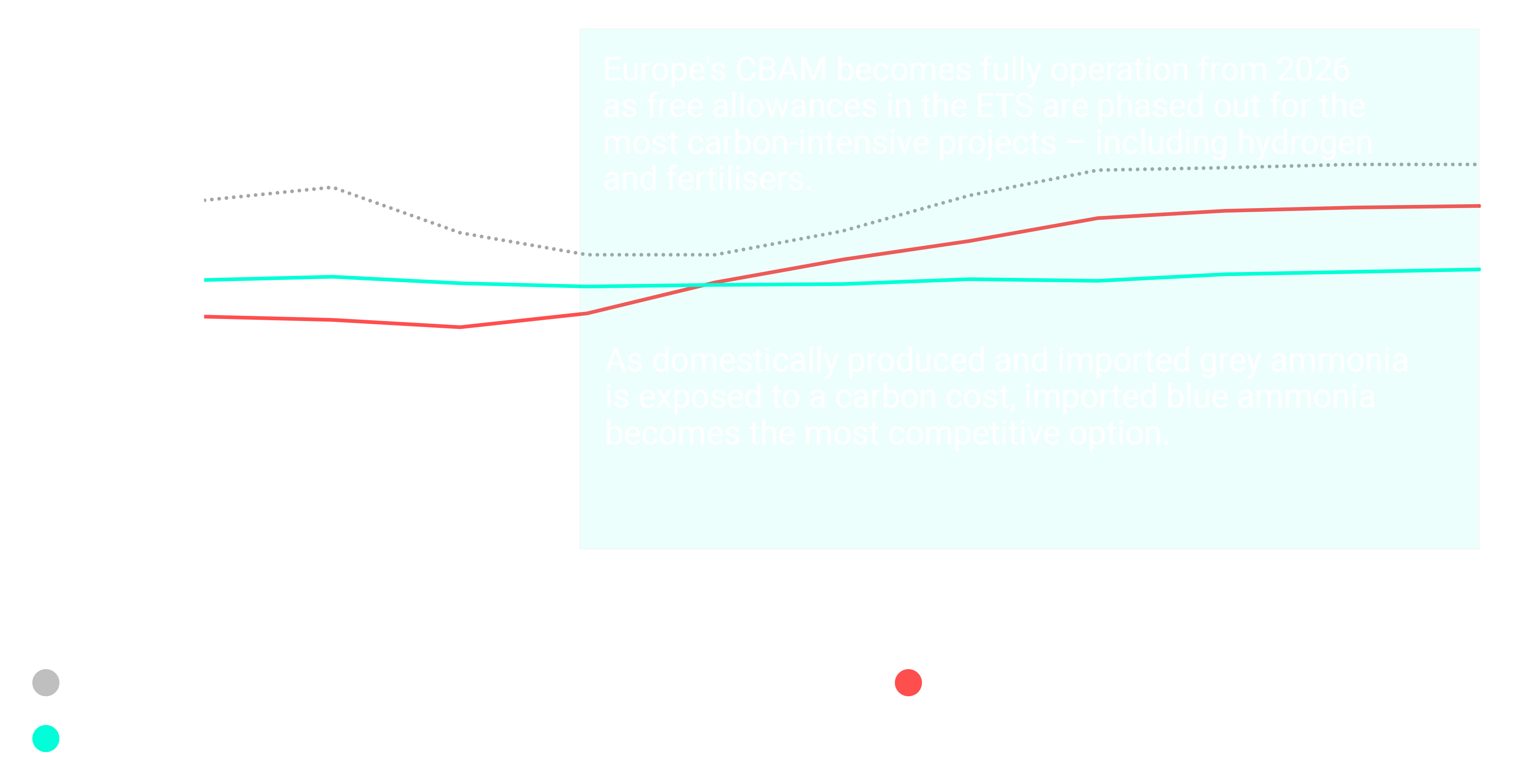 But what makes ammonia exports so compelling is the implementation of Europe’s Carbon Border Adjustment Mechanism (CBAM). This will be phased in as free allowances to European industries are removed, exposing both unabated European ammonia producers and importers to the full cost of the EU’s Emissions Trading System (ETS). This means that ammonia prices will increase by 60%, assuming a carbon price of US$100/t. Consequently, low-carbon ammonia exports to Europe will become the most competitive option.