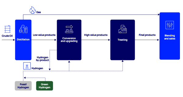 Hydrogen is a key ingredient in the chemical conversion and upgrade of crude oil into transport fuels and petrochemical feedstocks. It is also used to remove contaminants from road fuels, essential for sulphur-free fuels. Hydrogen is also a by-product of the conversion of naphtha to gasoline. But the volumes produced are insufficient to meet the refineries’ own needs, so additional hydrogen production from steam methane reforming is essential. Traditionally, this additional production involves the energy-intensive conversion of natural gas, releasing significant amounts of CO2 in the process.