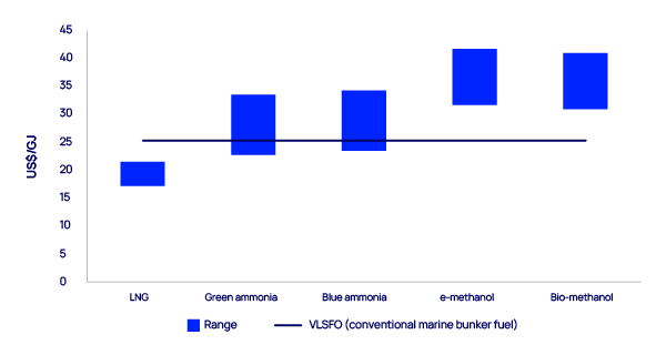 The International Maritime Organization’s (IMO) Net Zero Framework, published in April 2025, broadens interest globally. It introduces global greenhouse gas fuel intensity targets and a credit-trading system, with a fund potentially unlocking more than 80 Mtpa of hydrogen-derived fuels in the long term. However, under the current IMO pricing mechanism, it will take time for hydrogen-based fuels to be competitive with incumbent fuels, and further penalties or rewards will be required to displace fuel oil more quickly.