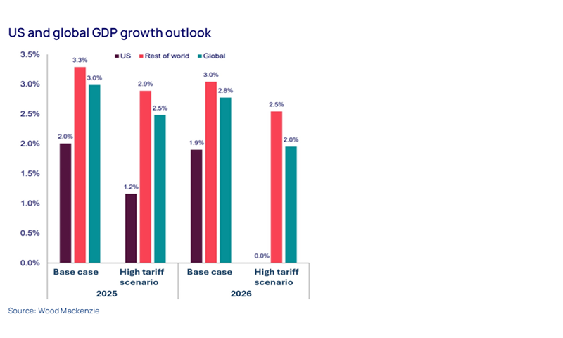 This shows US and international growth rates in two projections for 2025 and 2026, published by Wood Mackenzie’s head of economics Peter Martin last year. It compares our base case forecast with the high tariff scenario described above. If the new tariffs announced by President Trump last week remain in place, and China and the EU follow through with their threatened retaliation, our new base case will be closer to that high tariff scenario.