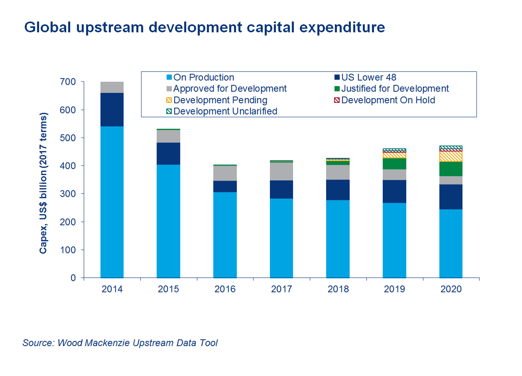 In our commercial base case, capital investment will stabilise at around US$400 billion per year to 2020, with US Lower 48 producers ramping up annual activity from US$64 billion in 2017 to US$90 billion in 2020 (in contrast, conventional outlay will fall by 7%).