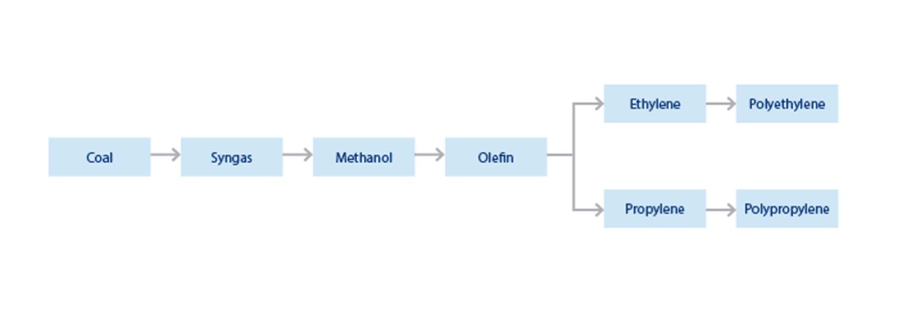 Methanol is an intermediate for the coal-to-olefins (CTO) process and a direct feedstock for the methanol-to-olefins (MTO) process. To produce the methanol intermediate for the CTO process, coal gasification produces syngas (carbon monoxide), which is then converted to methanol by traditional technologies.