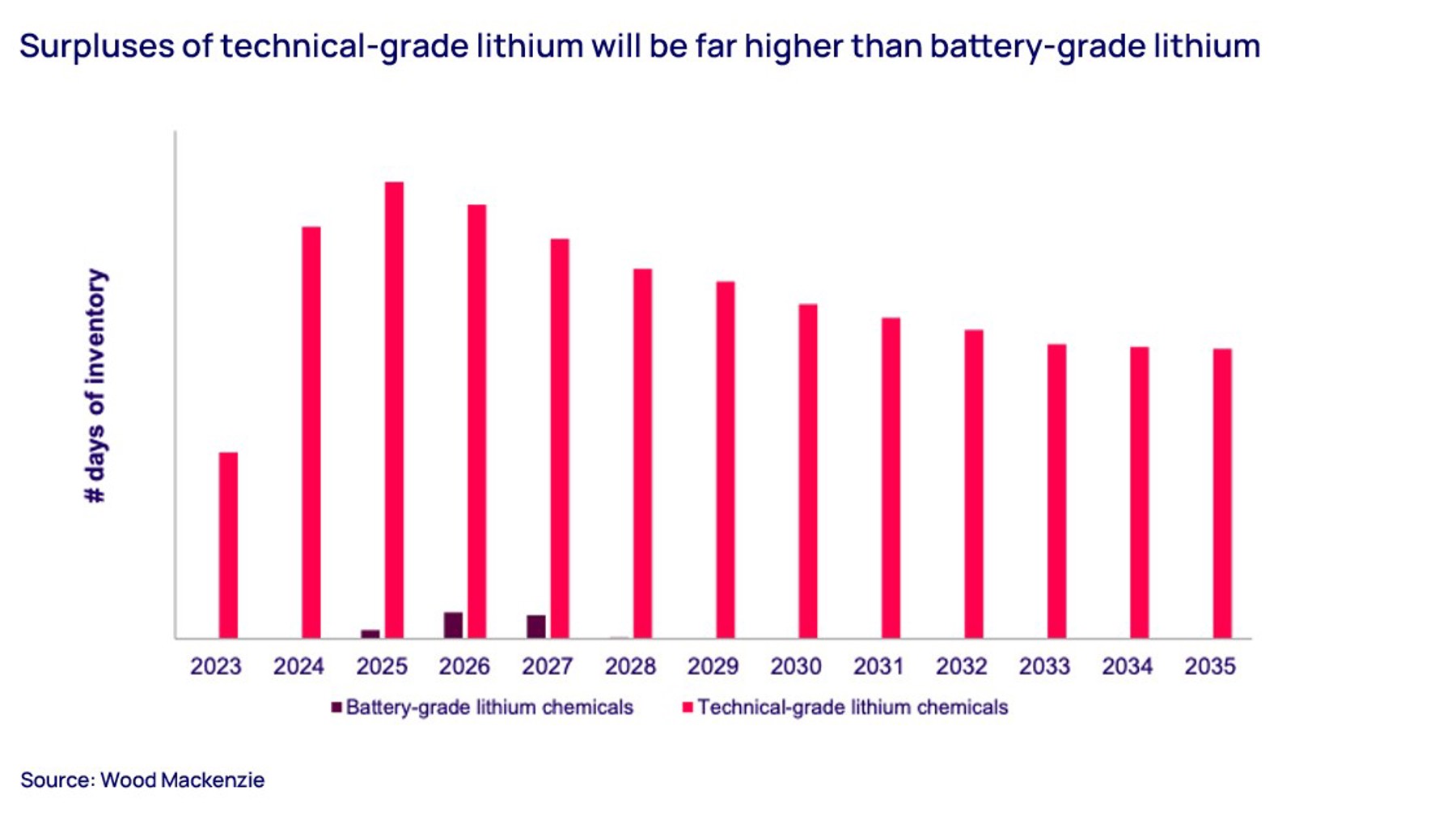 The expected 2026 surplus would equate to 97 days of demand produced for inventory – lower than the inventory level in 2020 of 103 days. However, this ignores the different product qualities involved. Battery-grade lithium is of the highest purity and so is more complex to produce; new plants therefore initially tend to produce a higher proportion of technical-grade lithium. As a result, the battery-grade lithium chemical market will only see a marginal surplus in the coming years; in contrast, the market for technical-grade lithium chemicals will see a significantly higher level of inventory days (see chart below).