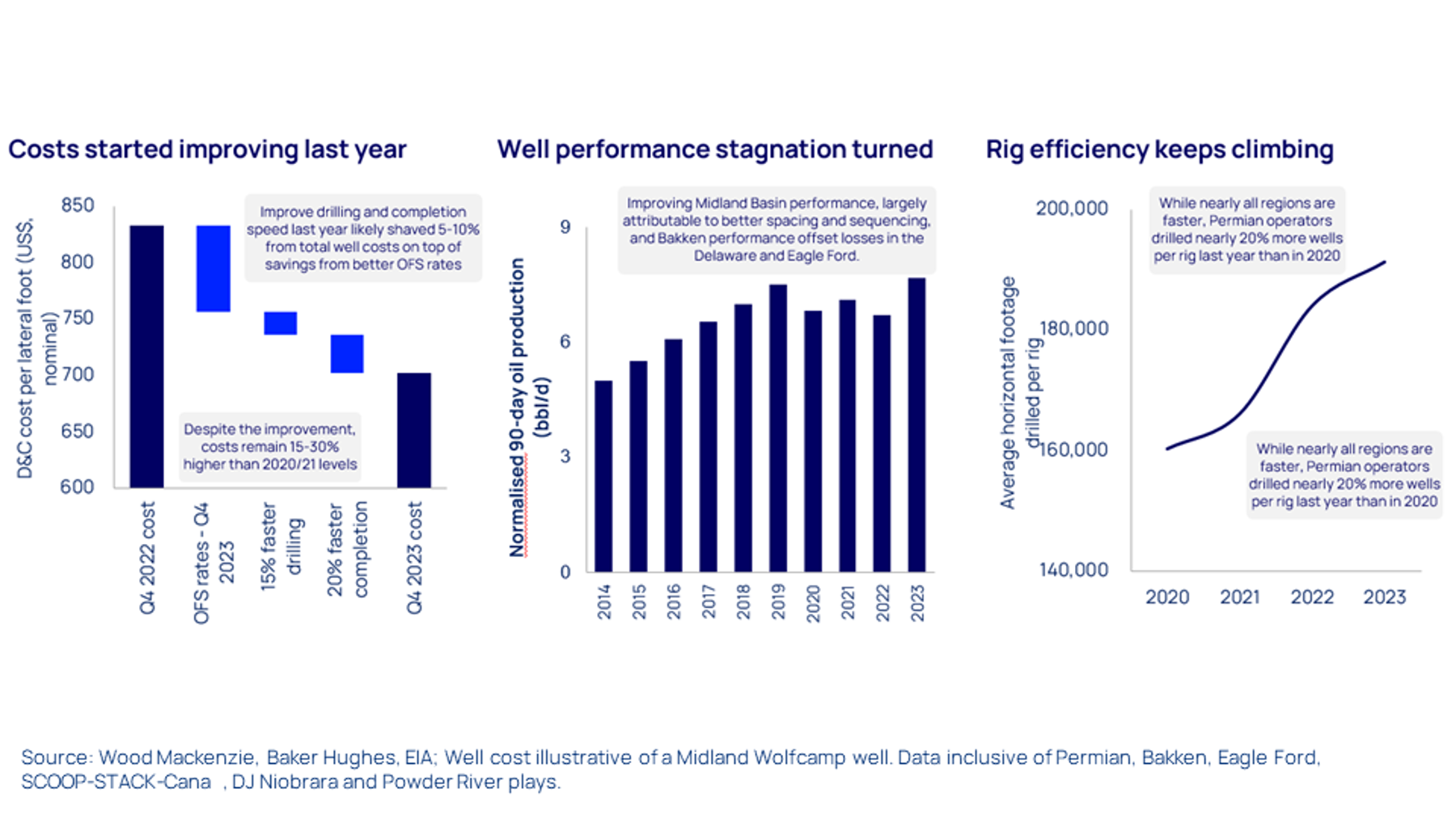 With an array of more effective processes being widely put to use, like super-spec rigs, more experienced crews, and new technologies like trimulFRAC, operators have managed to reverse some recent worrisome cost and performance signals. In fact, several leading tight oil players improved their spending efficiency by an average of 25% from 2022 to 2023.