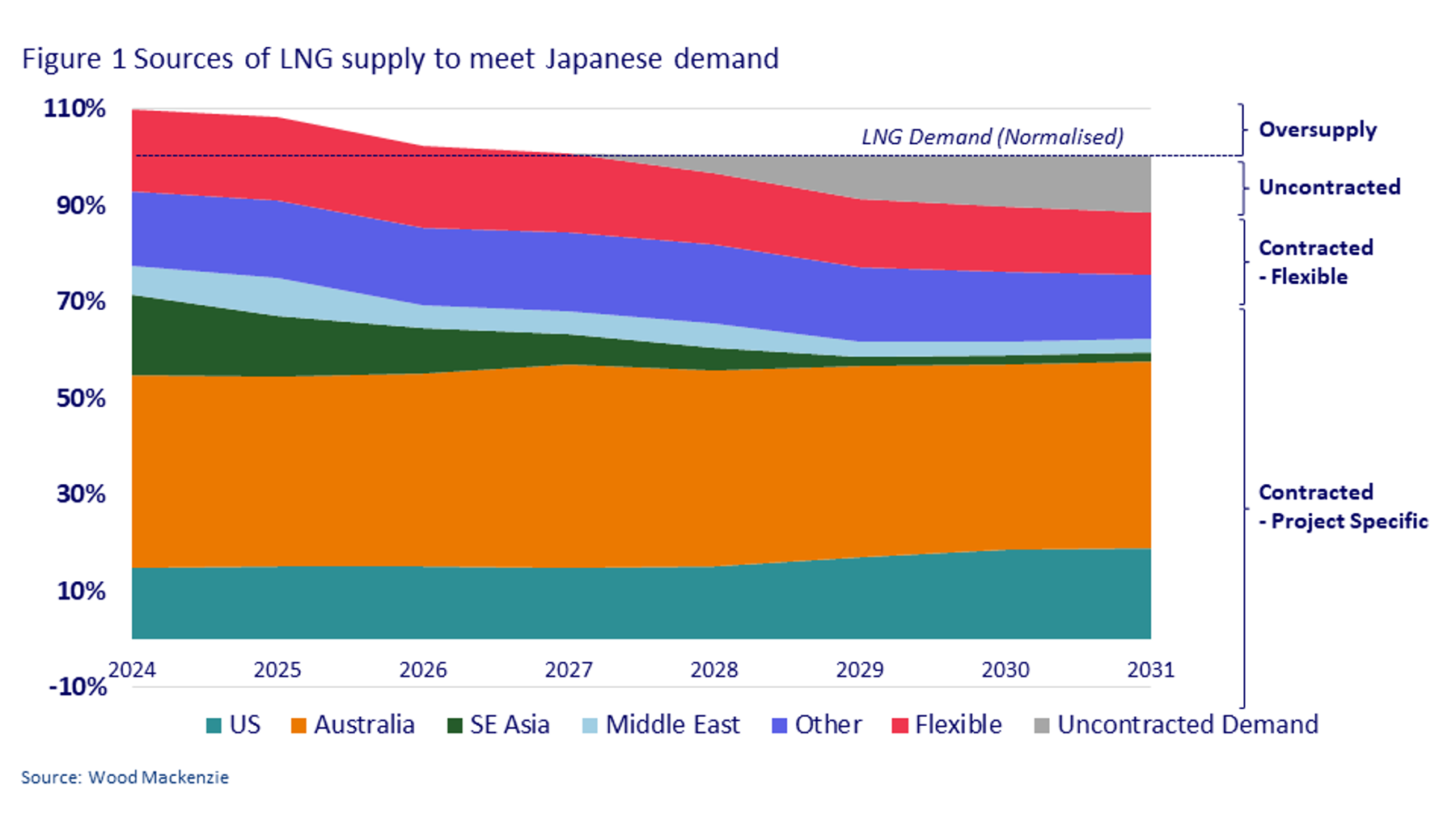 In Japan, LNG supply portfolios are evolving (Figure 1). In terms of supplies contracted from a specific project, with a decline in SE Asian and Middle Eastern supplies across the remainder of this decade, the market will be counter-balanced by a rising share of US and Australian LNG.