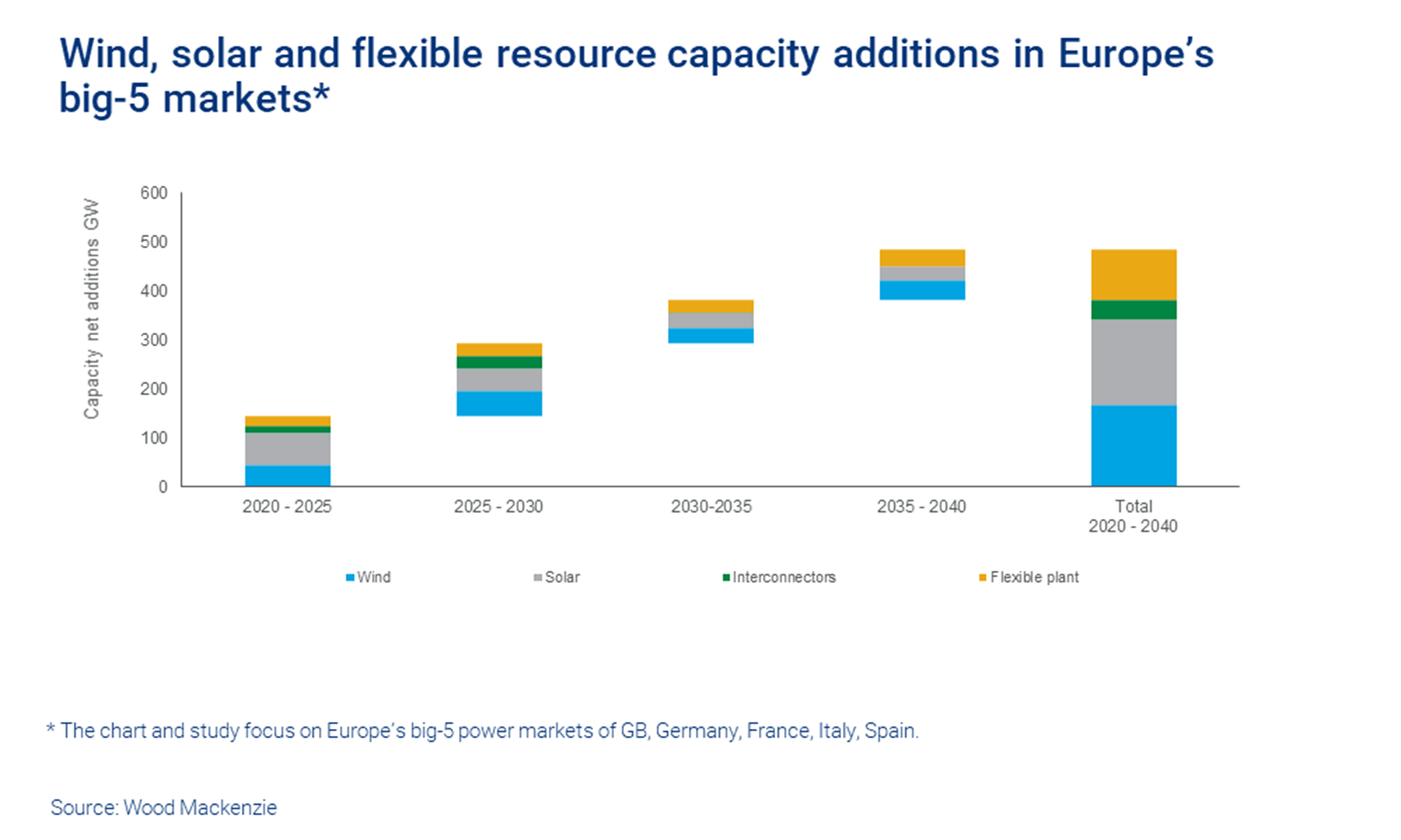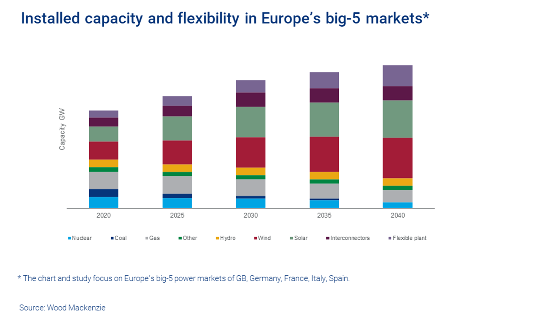 A combination of wind and solar power, otherwise known as Variable Renewable Energy (VRE), could make up the largest share of power capacity throughout Europe’s major markets – The United Kingdom, Germany, France, Italy and Spain – as early as 2023.