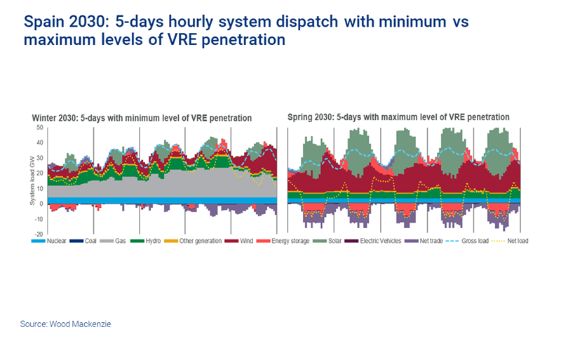 Look at the hourly power supply mix in Spain by 2030. On low VRE days the gas fleet continues to be the primary source of power, and it provides much needed flexibility. On high VRE days, with lots of wind and solar on the system, the net load (the dotted yellow line) is pushed into negative territory. That means there is more wind and solar being generated than system demand. This means you either curtail power from these resources, or use other sources of flexibility to manage the imbalance, such as exporting power through an interconnector to another power market, or charging a large, or lots of smaller batteries. It is also important to mention that at times of high VRE, with little conventional plant running i.e. huge volumes of spinning turbines on the system, the system loses inertia and becomes unstable.