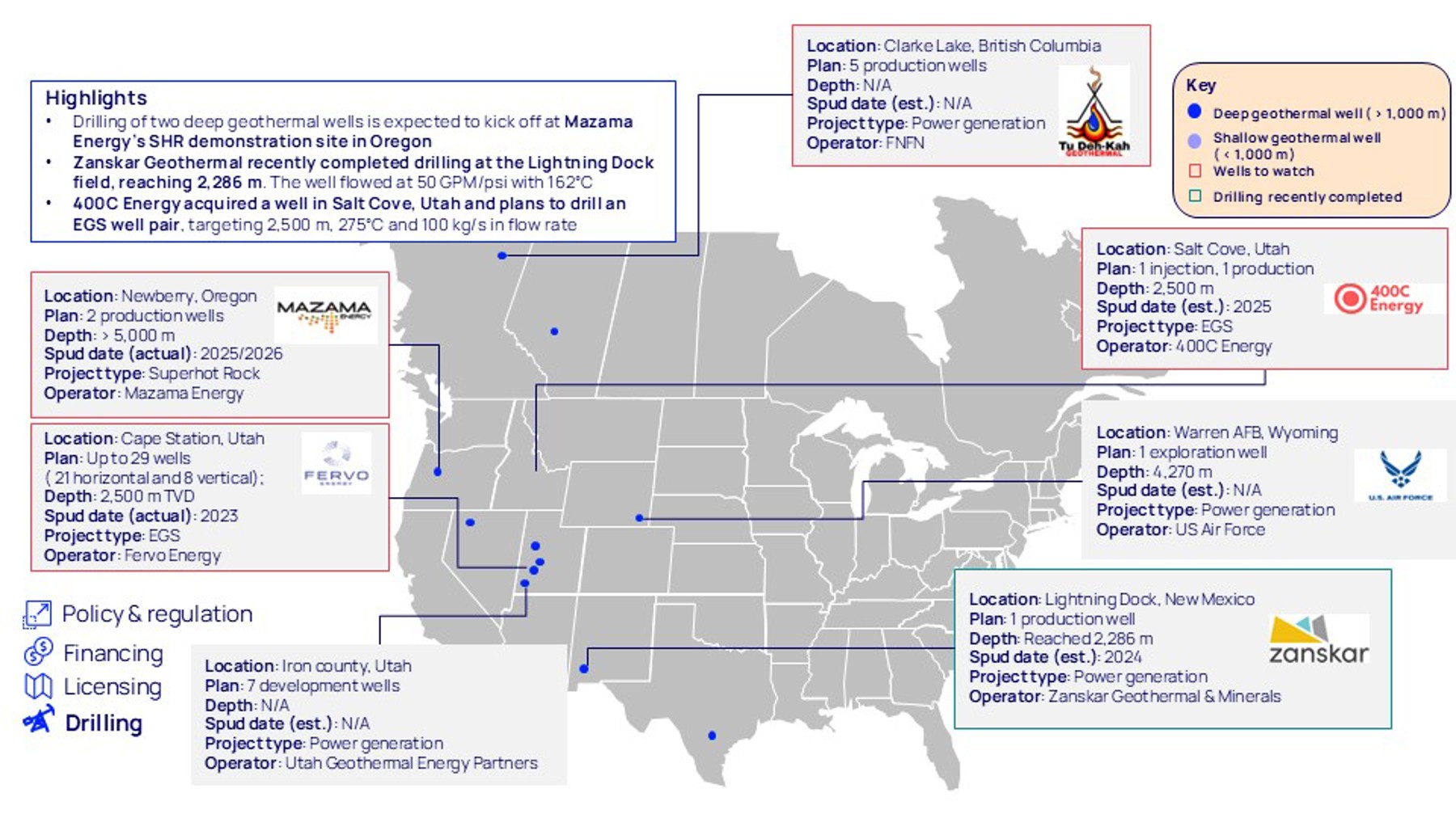 Newcomer 400C Energy recently acquired a well in Salt Cove, Utah where it plans to drill an EGS well pair. The project is targeting a depth of 2,500 metres, temperatures of 275°C and 100 kilogrammes per second in flow rate. Other sites in development include Fervo’s plan for up to 29 EGS wells at Cape Station in Utah, seven conventional development wells in Iron County, Utah, and exploration drilling at Warren Air Force Base in Wyoming. Not to be left out, Canada has a project for five production wells planned in Clarke Lake, British Columbia, developing conventional power generation capacity.