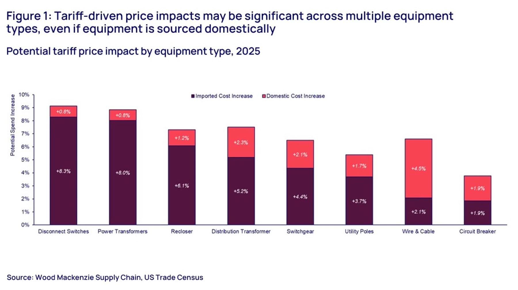 Recent analyses by Wood Mackenzie indicate that tariffs could lead to a 1% to 5% increase in total supply chain spending for US utilities. This impact is most significant in categories that have already faced considerable disruption and price escalation, such as transformers, switchgear, and other electrical equipment.