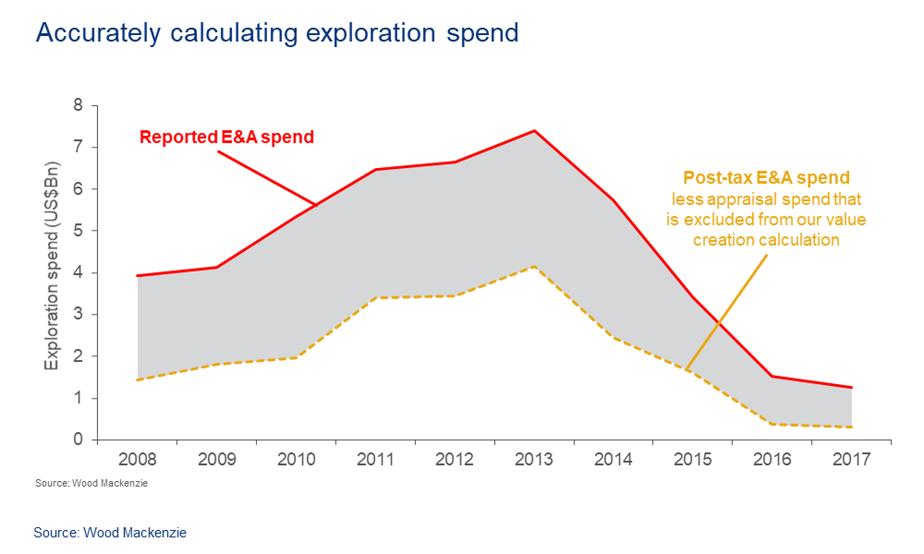 If we look at Petrobras’ exploration between 2008 and 2017, legacy appraisal in this case would refer to any discoveries made before 2008. In our calculations, we exclude legacy appraisal spend before applying tax relief. We end up with a number that is 55% less than reported exploration costs – a material change that is too big to be ignored. It is this number we input into our value creation calculation.