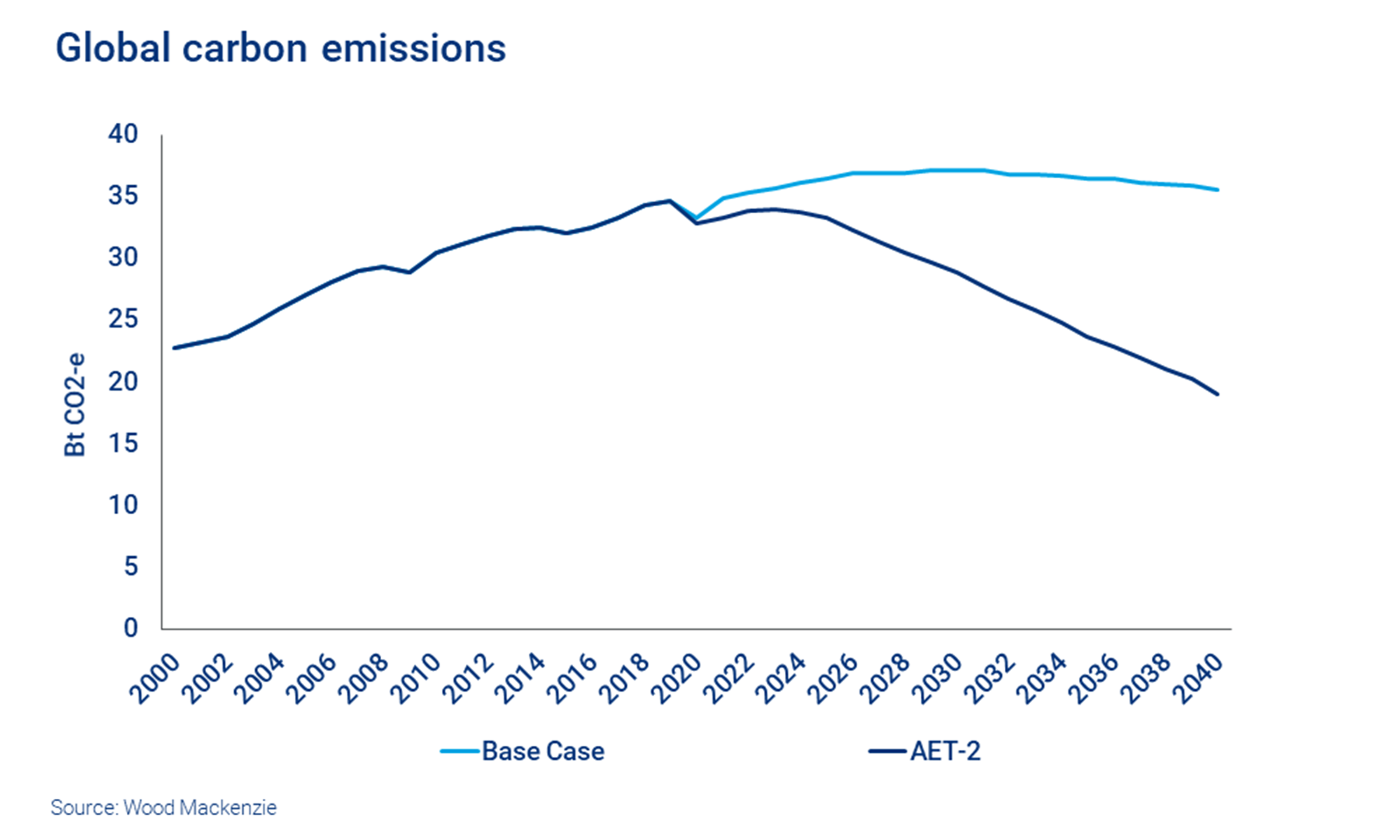 The relatively low carbon footprint of gas means it is among the most resilient of all the fossil fuels under a fast-tracked decarbonisation scenario – Wood Mackenzie's Accelerated Energy Transition Scenario-2 (AET-2) – which considers a possible pathway to limiting global warming to under 2° C by 2050.