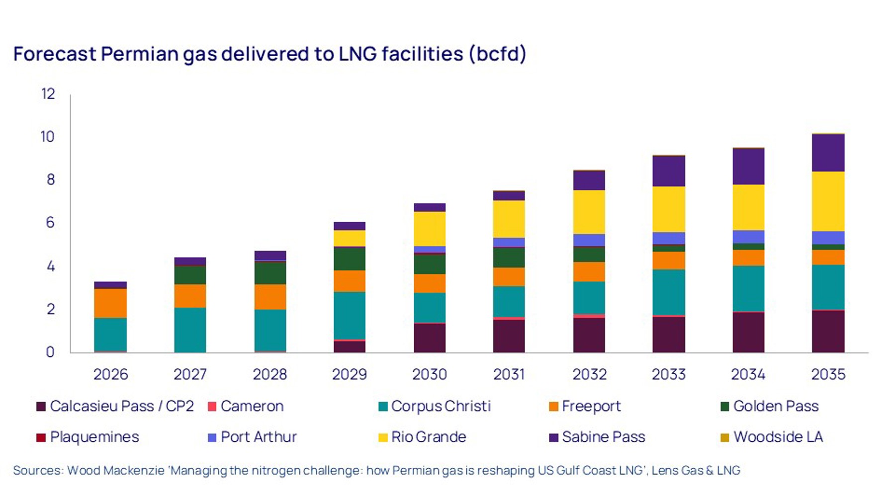 By the mid-2030s, the Permian is expected to deliver over 10 bcfd of gas to Gulf Coast LNG facilities, nearly one-third of the region’s projected feedgas demand. As this supply expands eastward, the nitrogen challenge will reach western Louisiana facilities that are increasingly reliant on Permian gas.