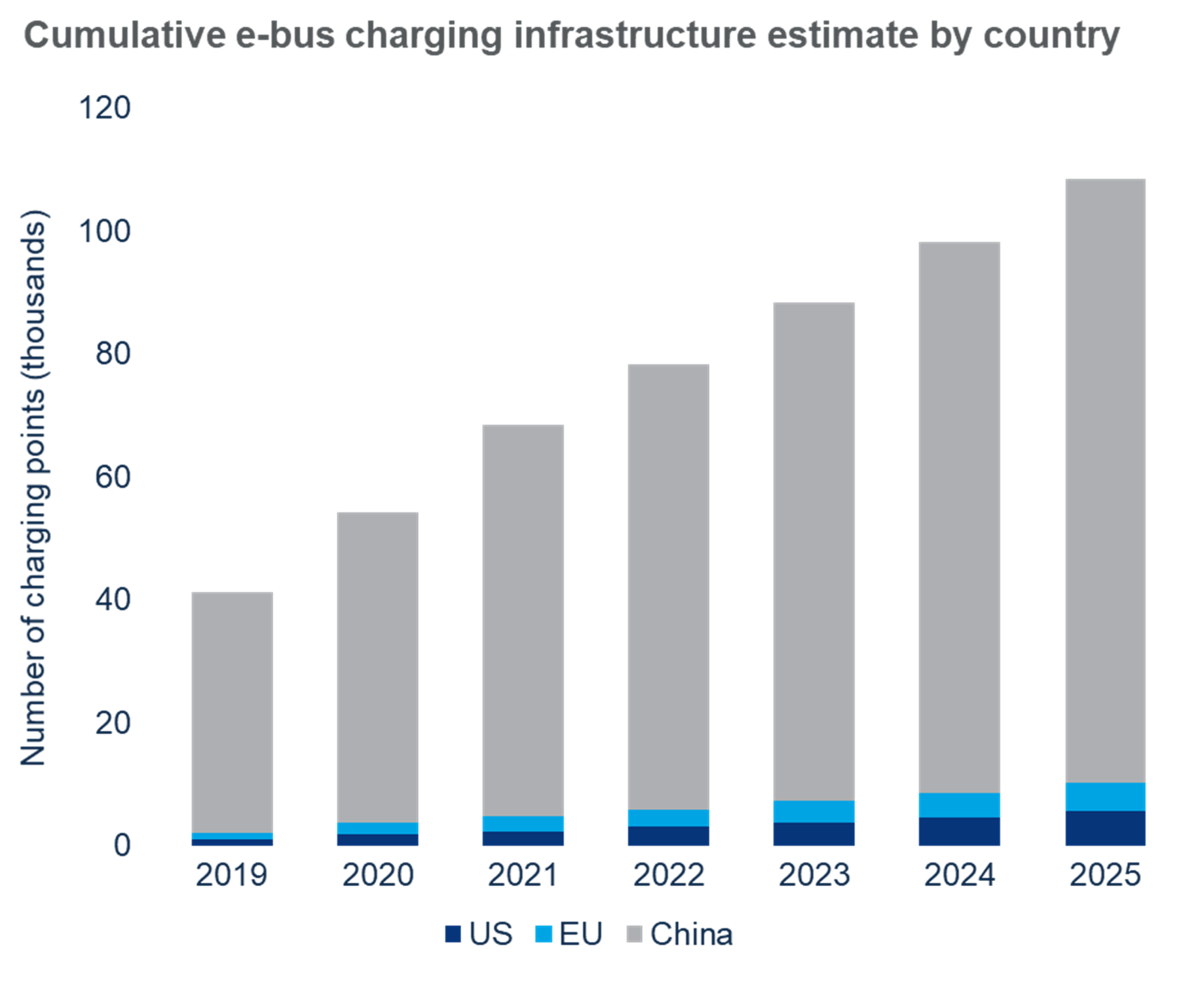 The deployment of e-bus charging infrastructure has already started to surge in China. However, growth in the US and Europe is limited by the size of existing pilots – where one to five charging points are typically enough to support several buses. Despite this, the total number of charging points for all three regions will more than double to a total of 108,000 charging points by 2025.