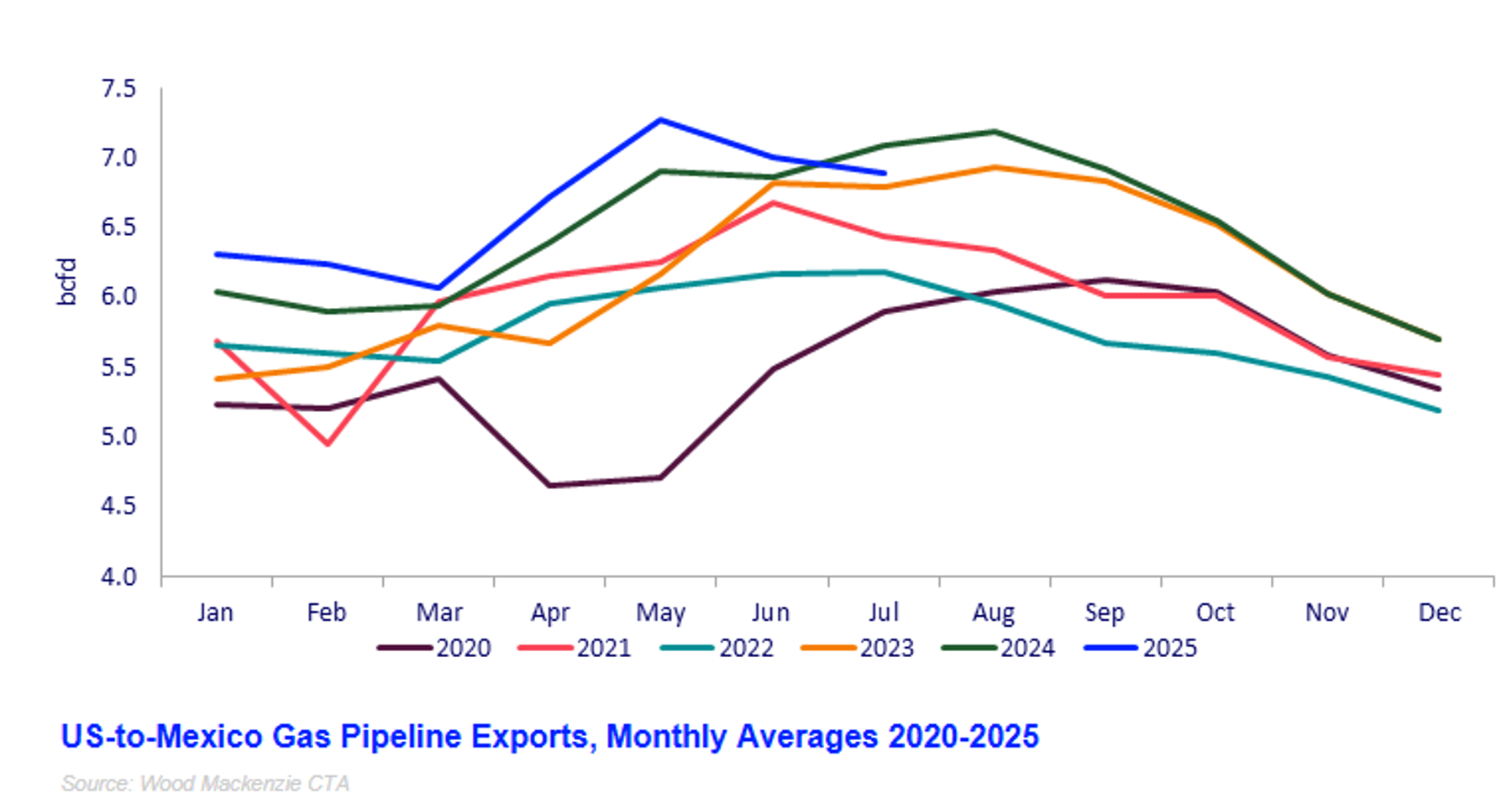 In May, exports reached 7.3 billion cubic feet per day (bcfd) whereas in July were just below 6.9 bcfd