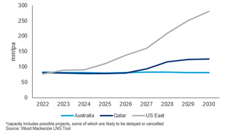 In 2022, the US was the third-largest exporter of LNG at 76.4 million metric tonnes per annum (mmtpa). With the resumption of the Freeport facility, the US will surpass Qatar and Australia this year to export 89 mmtpa. However, it won’t stop there. Wood Mackenzie predicts that based on the combination of projects already under construction and momentum of potential projects, US LNG capacity could grow between 70 mmtpa and 190 mmtpa before the end of the decade, potentially more than doubling current exports.