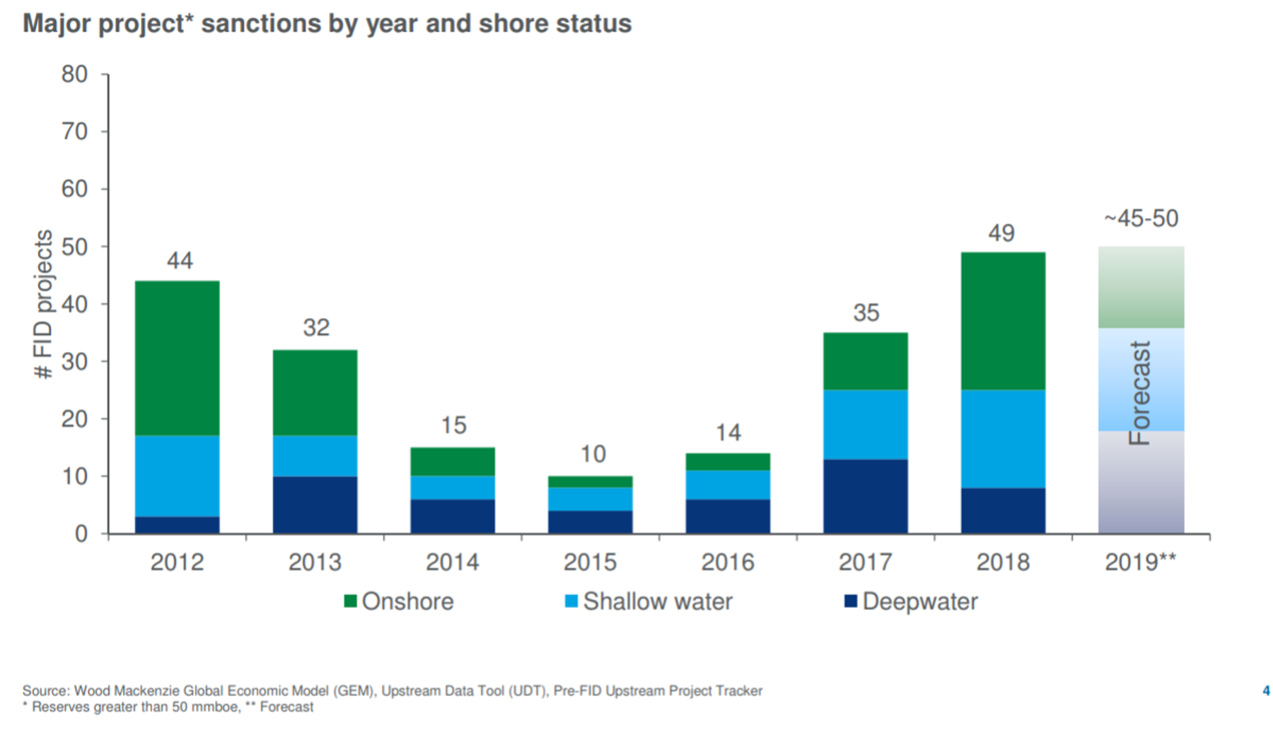 You’ll get access to analysis and data on over 160 major projects which account for 134 billion boe of reserves. The report includes charts like this one, tracking major project sanctions by year since 2012.