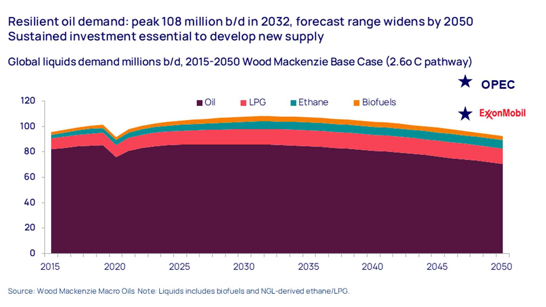 Our demand forecasts through the 2030s have remained largely unchanged. Others though have made material upgrades to their numbers recently and now align more closely with ours. However, a widening spread starts to emerge further out, with international oil companies (IOCs) and other sources far more bullish than Wood Mackenzie. For example, TotalEnergies projects 98 million b/d by 2050, ExxonMobil 105 million b/d, the IEA 113 million b/d (in its Current Policies Scenario) and OPEC 123 million b/d.