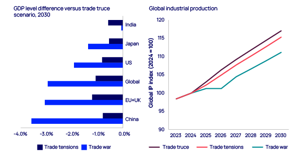 Under our trade-war scenario, the US implements the tariffs announced on 2 April in full, with trading partners retaliating. The US effective tariff rate quickly exceeds 30%. This causes maximal supply-chain disruption, including US-China decoupling, triggering a global recession. In this scenario, global GDP is 2.9% lower by 2030.
