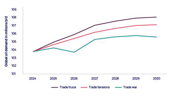 In the trade truce scenario, global oil demand continues to grow steadily, boosted by stronger economic growth. Demand increases by 4.4 million barrels per day (b/d) from 2024 to 108 million b/d in 2030, broadly in line with our pre-tariff base case.