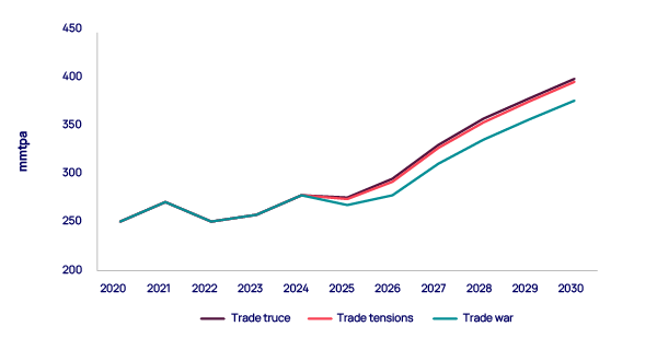 Under the trade truce scenario, with trade barriers returning to 2024 levels, the global LNG market remains tight in 2025, despite weak Asian LNG demand. Europe needs to rebuild storage after a cold winter, while facing the loss of further Russian supply following the end of the Ukraine transit agreement. But the anticipated oversupply emerging from 2027 remains inevitable, even if tariffs are removed. With a major expansion of LNG supply already under construction and more supply expected to reach final investment decision (FID) in the coming years, LNG supply is set to increase by , more than 40% higher than current levels. Asian LNG demand will enter a new phase of growth, increasing by 120 Mt by 2030, but Europe will need to absorb more LNG than required, pushing average prices down from US$11.2/mmbtu in 2024 to around US$7.2/mmbtu by 2030.